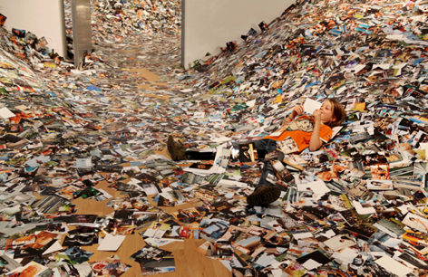 En 2011, l’artiste néerlandais Erik Kessels a créé une installation intitulée Photography in Abundance, qui consistait à déverser environ un million de photographies imprimées en format de 4 x 6 pouces dans l’espace de la galerie Foam à Amsterdam. Il s’agissait en fait de la quantité exacte de photographies téléversées par les utilisateurs sur Flickr en une journée, que Kessels a fait imprimer puis disperser dans les diverses pièces de la galerie. Le résultat est d’abord impressionnant par son ampleur : la quantité de photographies est en effet choquante ; à cela s’additionne le fait que nous ne sommes quasi jamais exposés à la matérialité des photographies lorsqu’elles demeurent sous forme de documents numériques. Par son œuvre, Kessels vient créer une tension palpable entre l’espace physique et l’espace numérique. En observant les photographies qui documentent l’installation, nous en venons rapidement à constater l’absurdité d’appliquer des modes relatifs à l’environnement analogique, dit « traditionnel », au numérique.