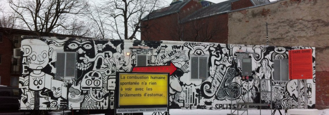 Image d’en-tête : Marc-Antoine K. Phaneuf, Moments magiques, 2012-2013, devant la roulotte Dare-dare installée sur l’esplanade du métro St-Laurent. Crédits : retis